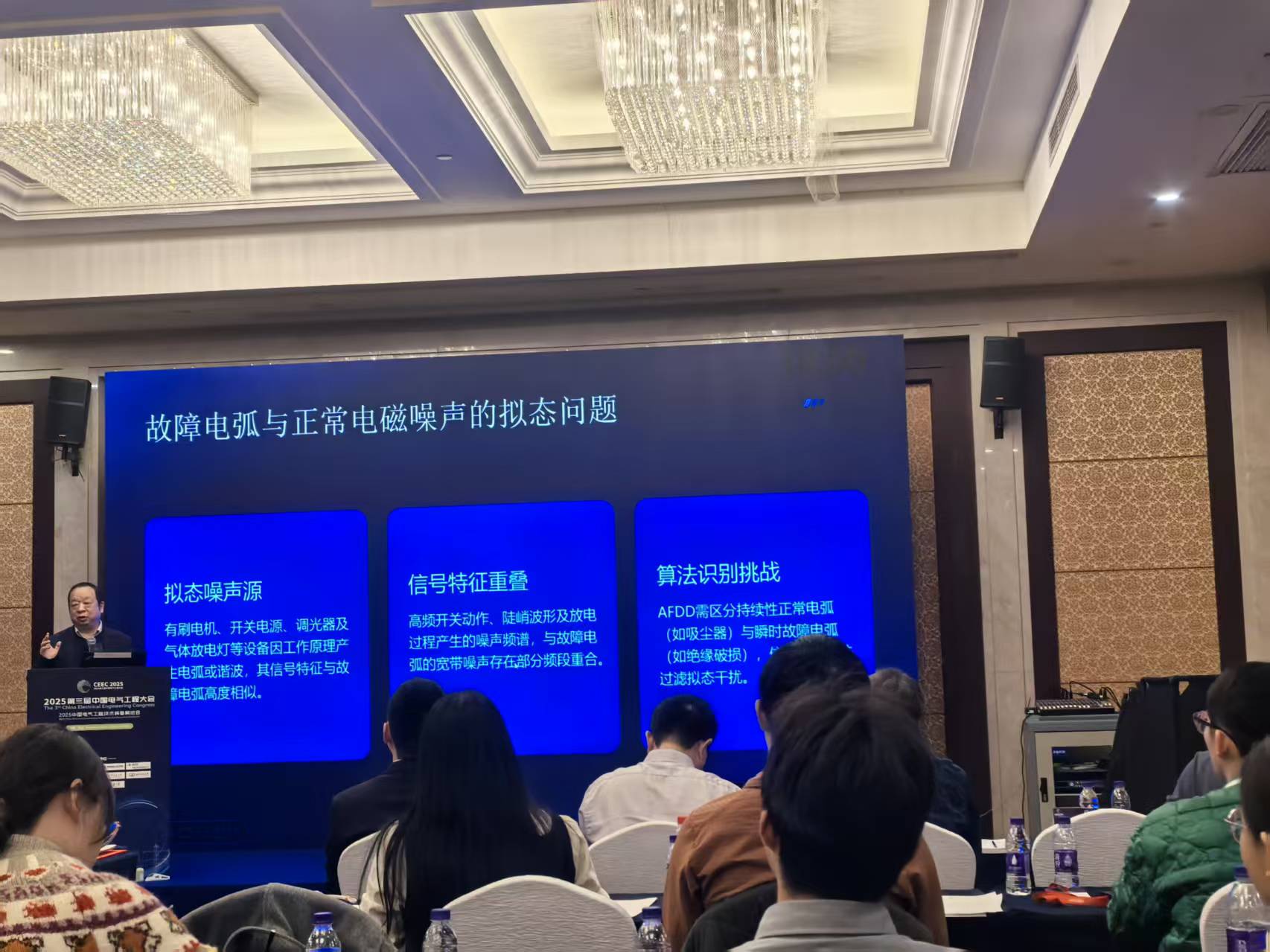 在備受關注的“用電安全智能化技術”分論壇上,竺紅衛教授發表題為《基于機器學習的故障電弧保護技術研究》的主題演講,深入探討人工智能技術在電氣火災預警與防控中的關鍵作用,引發與會嘉賓熱烈反響。竺紅衛教授在演講中系統介紹了當前故障電弧檢測面臨的技術瓶頸,如傳統閾值判據誤報率高、復雜負載干擾大等難題。他指出:“隨著新型電力系統和智能建筑的發展,用電環境日益復雜,亟需更精準、自適應的故障識別手段。”基于此,團隊近年來致力于將機器學習算法深度融入電弧檢測模型,構建了融合時頻特征提取、輕量化神經網絡推理與邊緣計算部署的一體化解決方案。該研究成果已在多個典型場景中完成試點驗證,在住宅、商業綜合體及工業配電系統中實現了對串聯故障電弧、并型故障電弧的高靈敏度識別,平均檢測準確率超過96%,顯著優于現行國家標準要求。